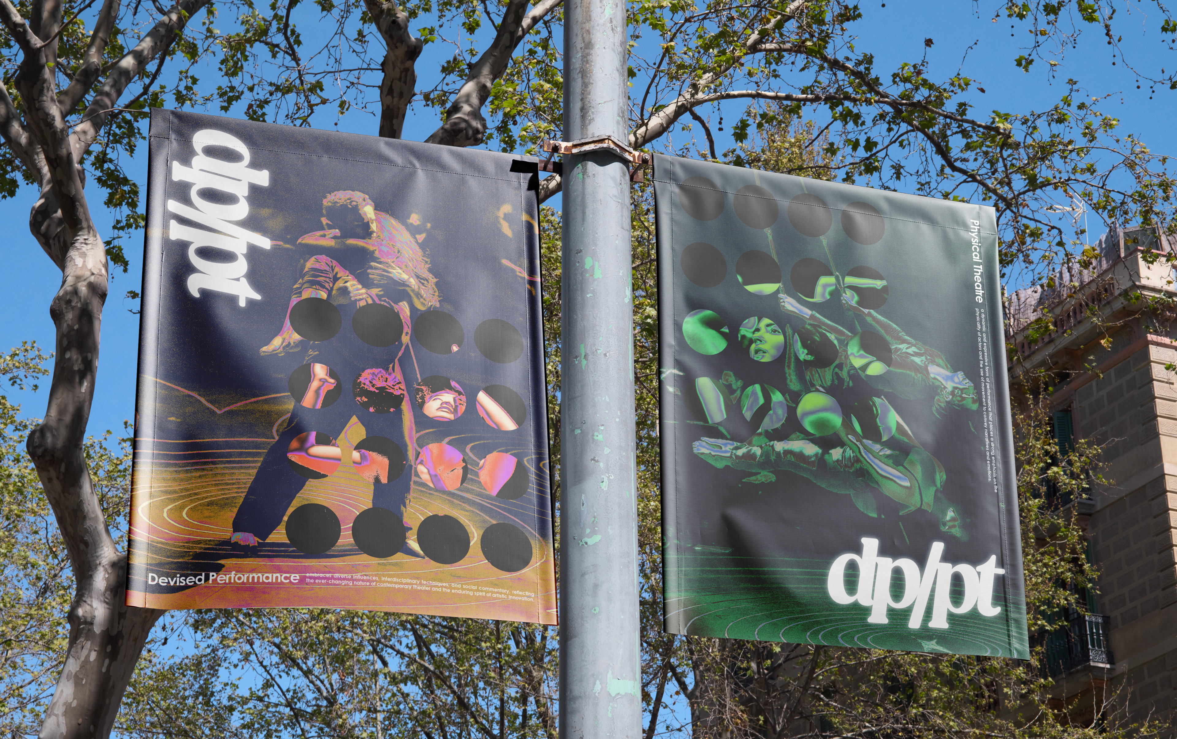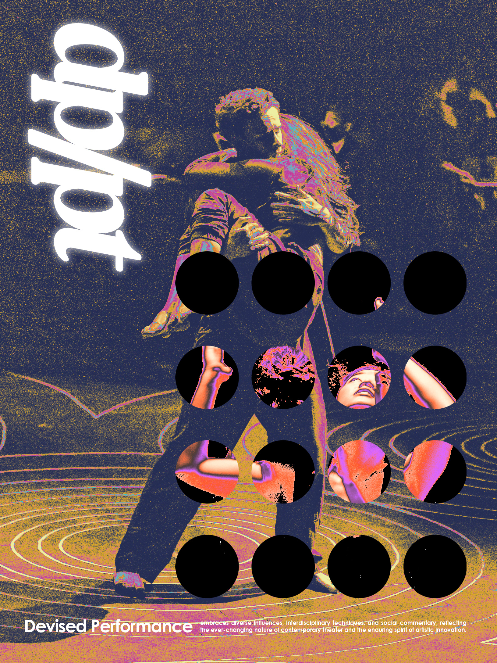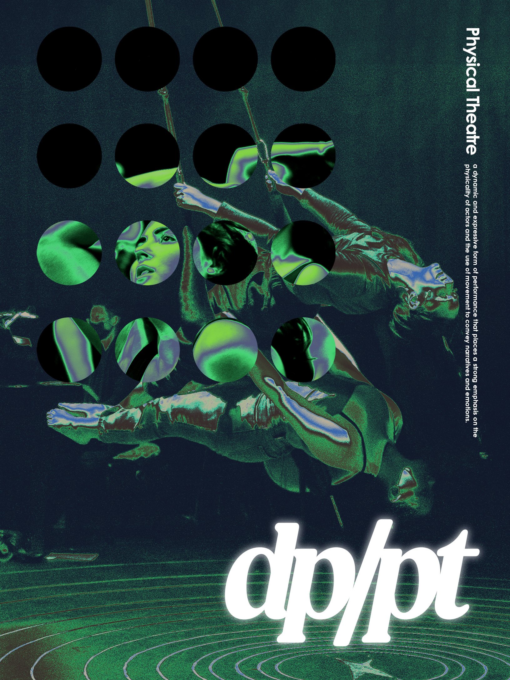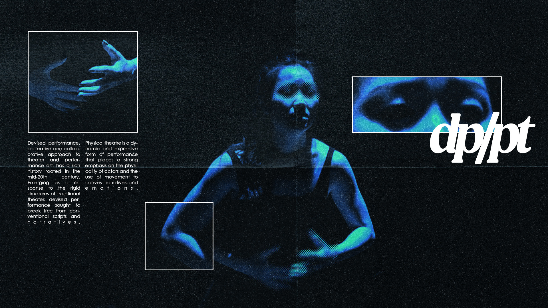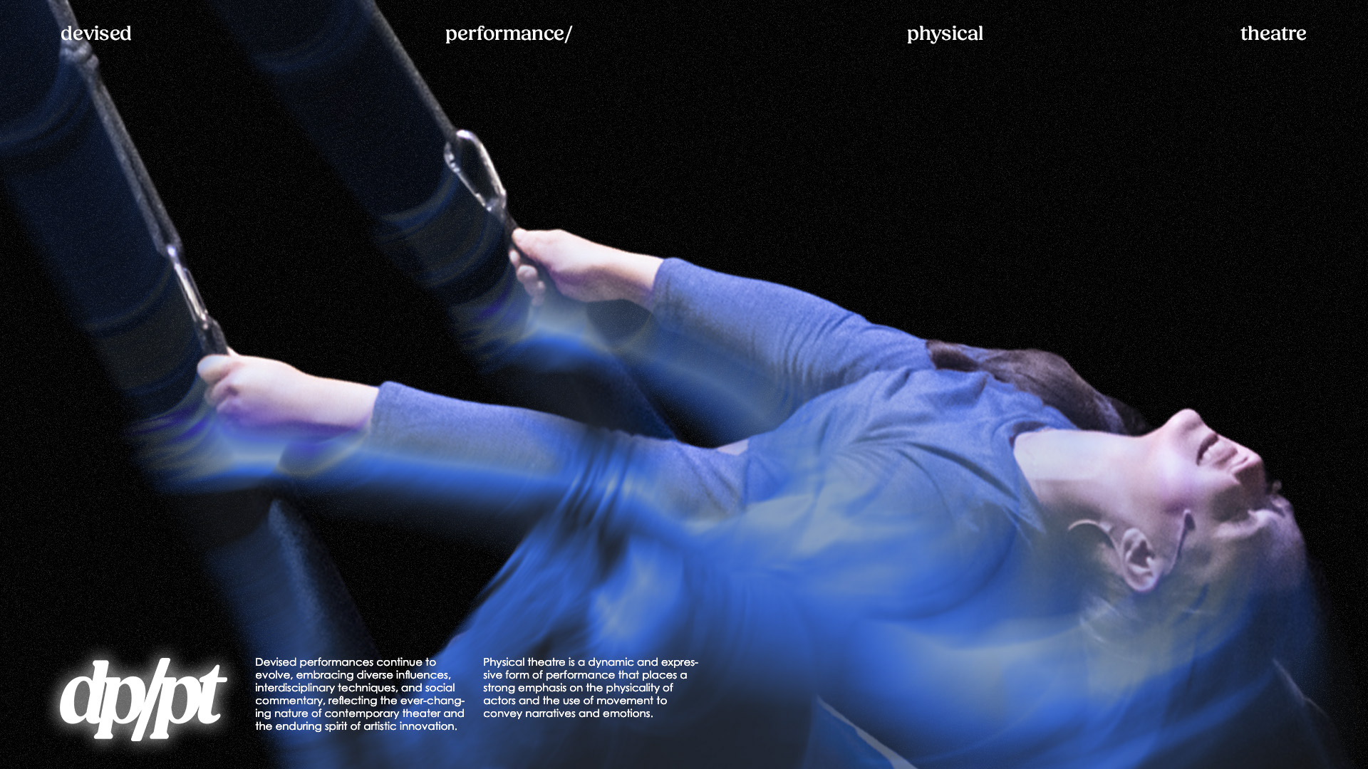 DP/PT is a new form of visual art deriving from theatre + dance characteristics; the art form showcases rigorous, performative, and impromptu physical activity. It is further mixed with music, dance, and theatre.