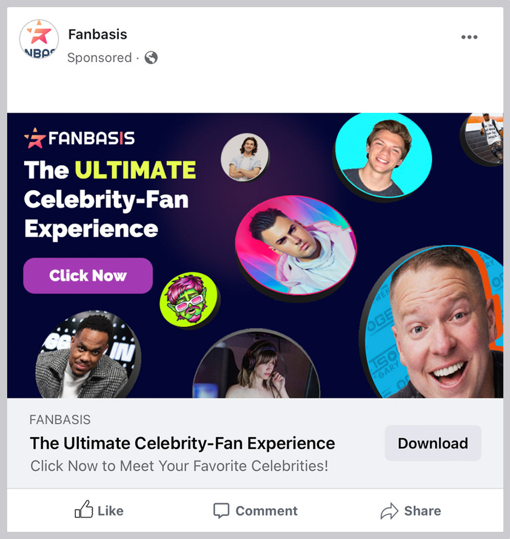 I designed a campaign for Fanbasis through advertisements designated for Facebook, Instagram, TikTok, Snapchat, Google, LinkedIn, and Twitter for my internship at Instaboost Media. Fanbasis is a marketplace that lets content creators create a storefront, where they can sell virtual experiences to their fans.