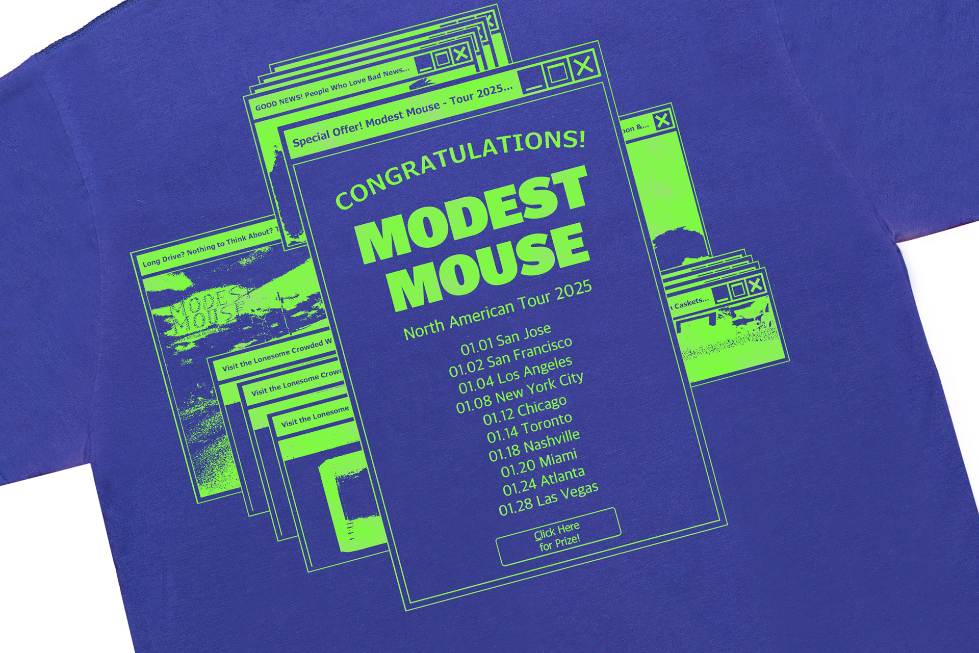 After spending some time listening to Modest Mouse, watching their music videos, and familiarizing myself with their abstracts thoughts and impactful stories, I became a bigger fan than I already was. So I decided to design merchandise that elevates their ideals all while looking fashionable.