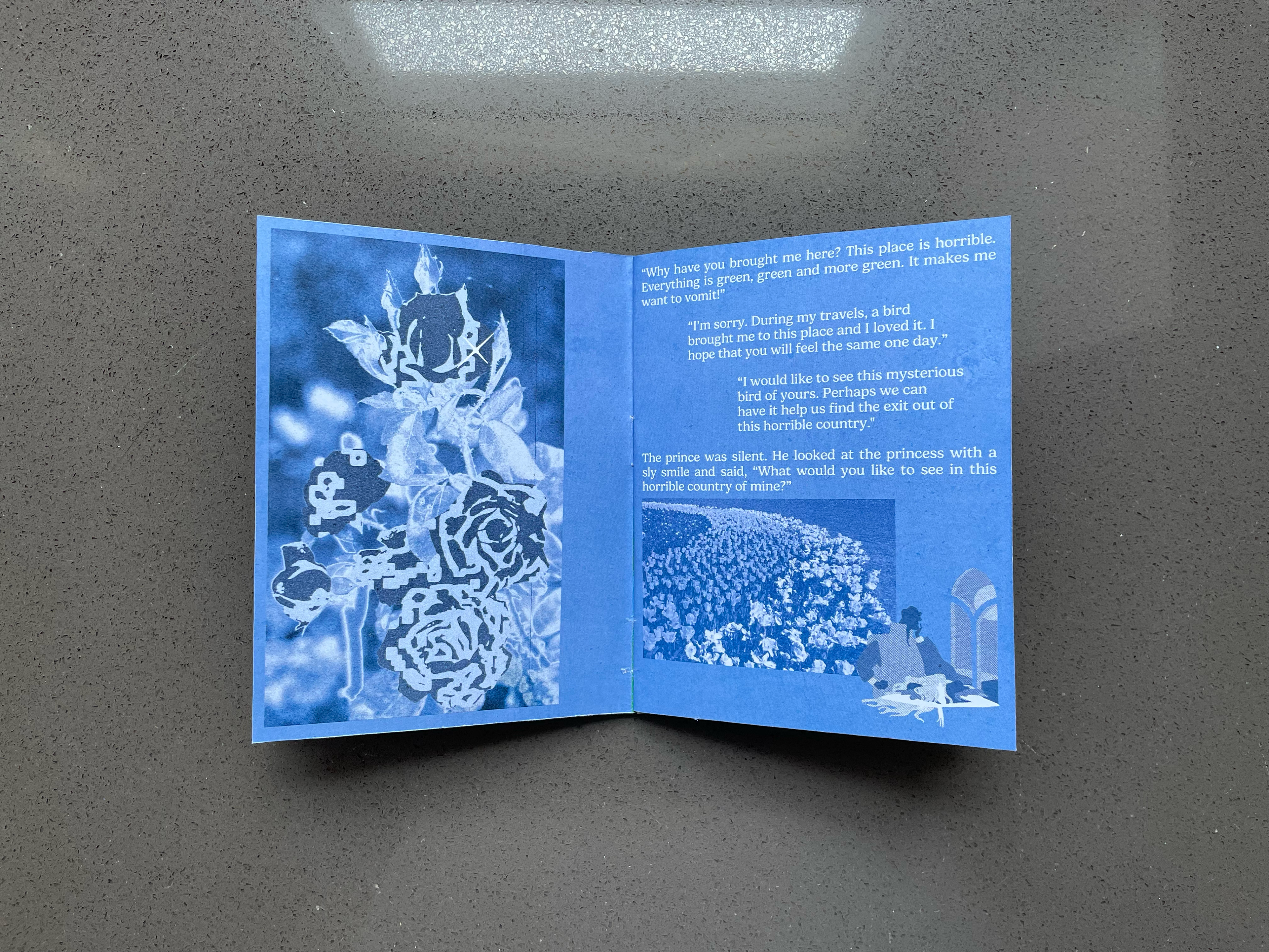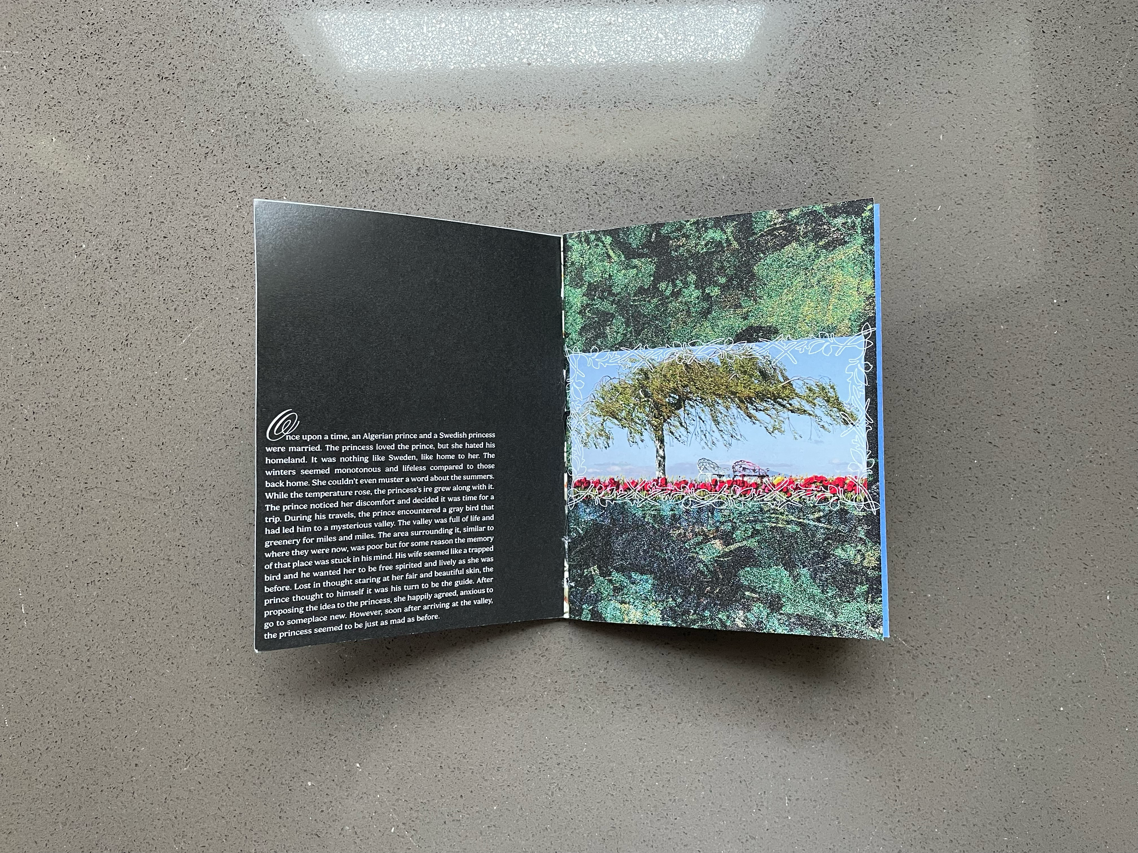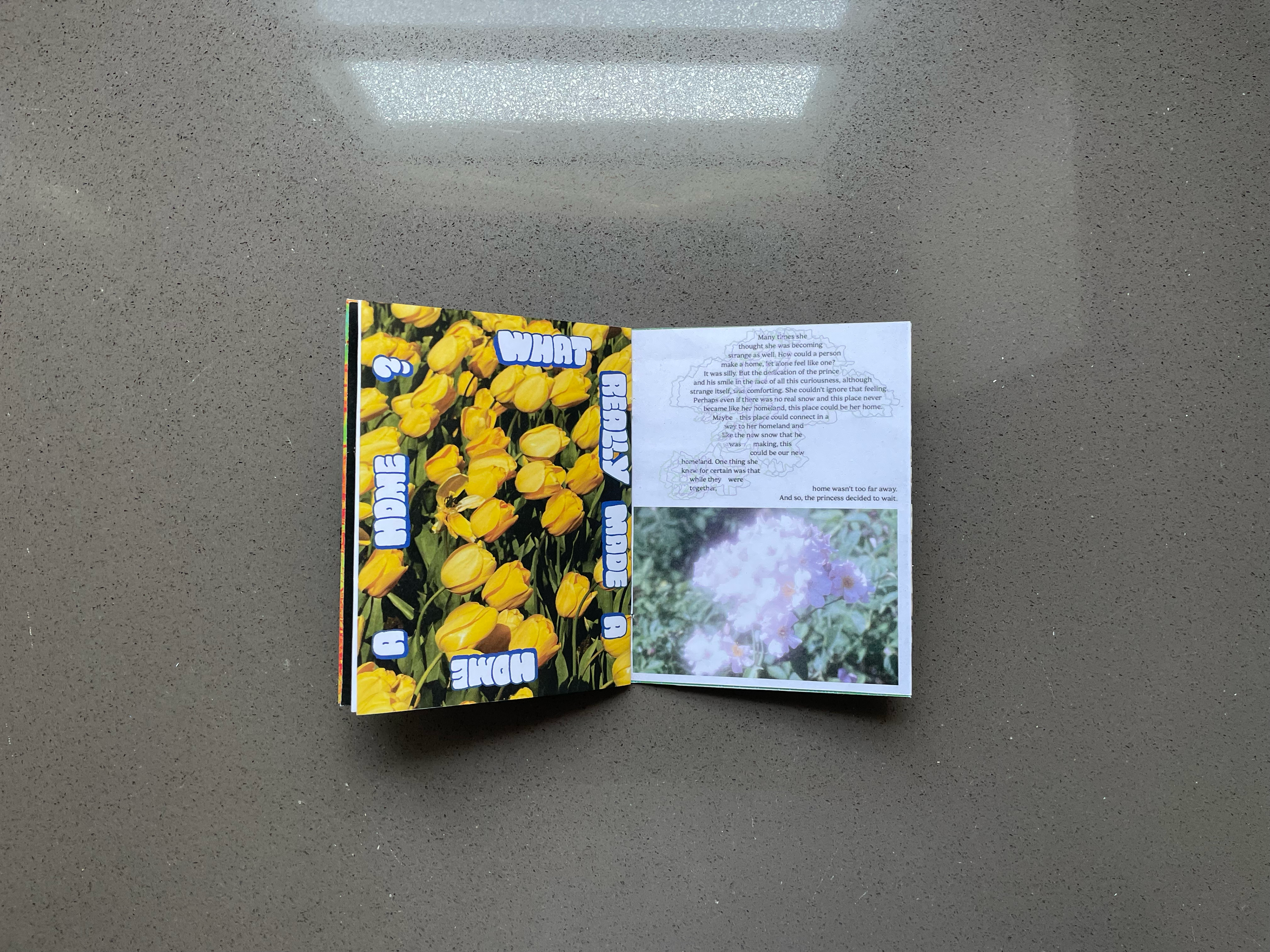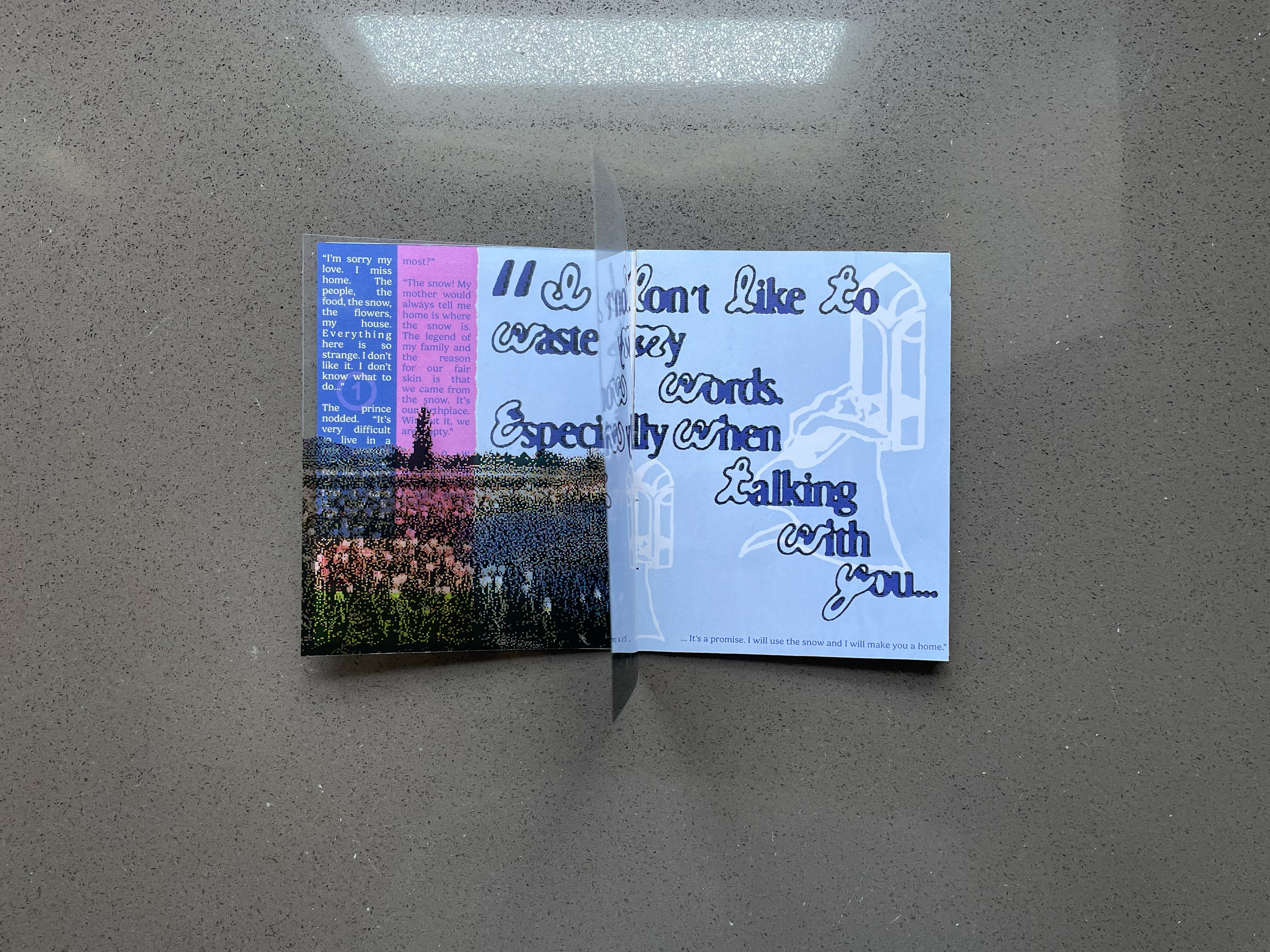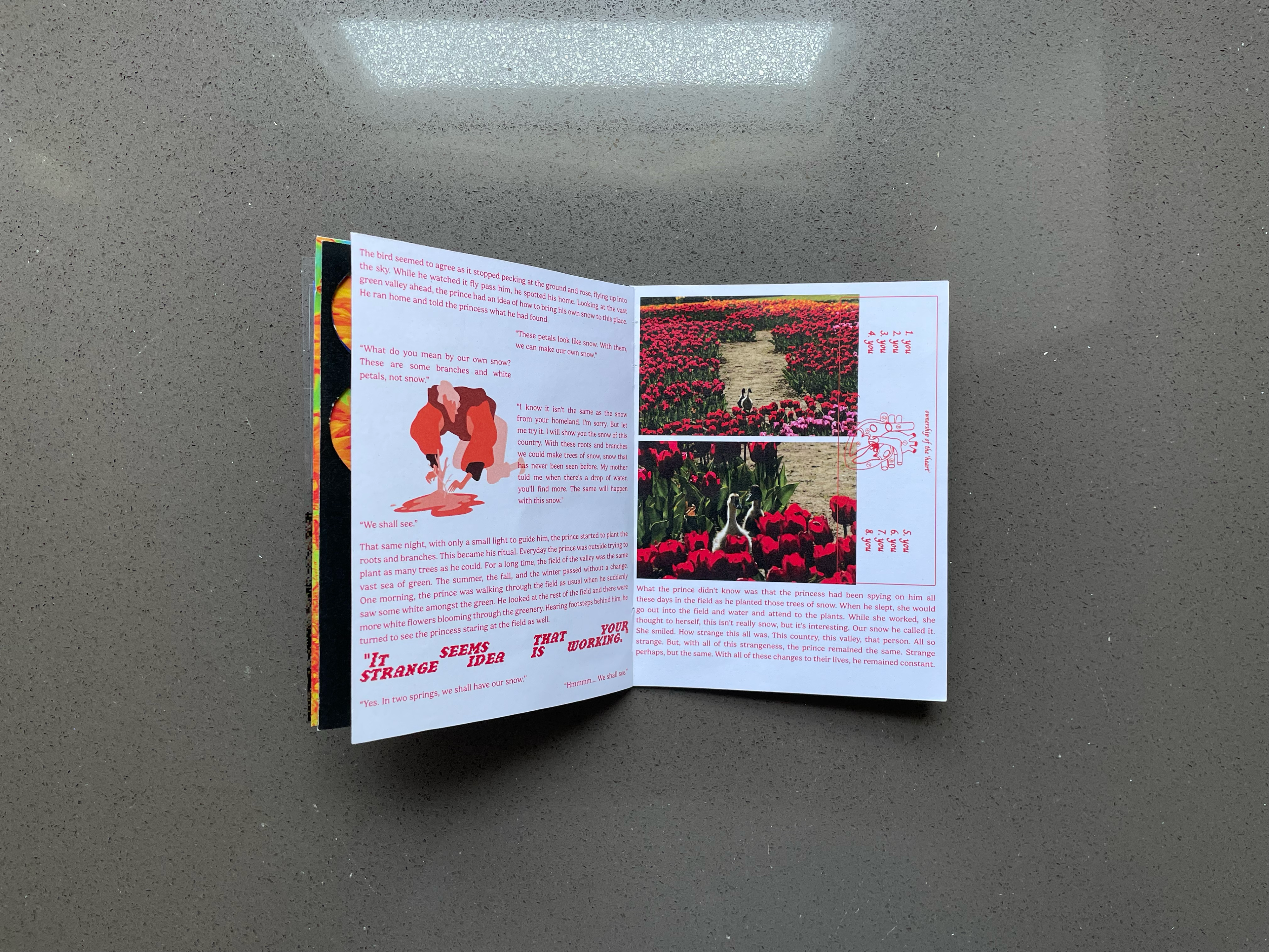 In collaboration with Philip and Aremo, I designed a zine that holds a story about a prince and a princess' compromise to finding a home. The story presents a special moment through the usage of flowers, which is the focus on the zine's theme.