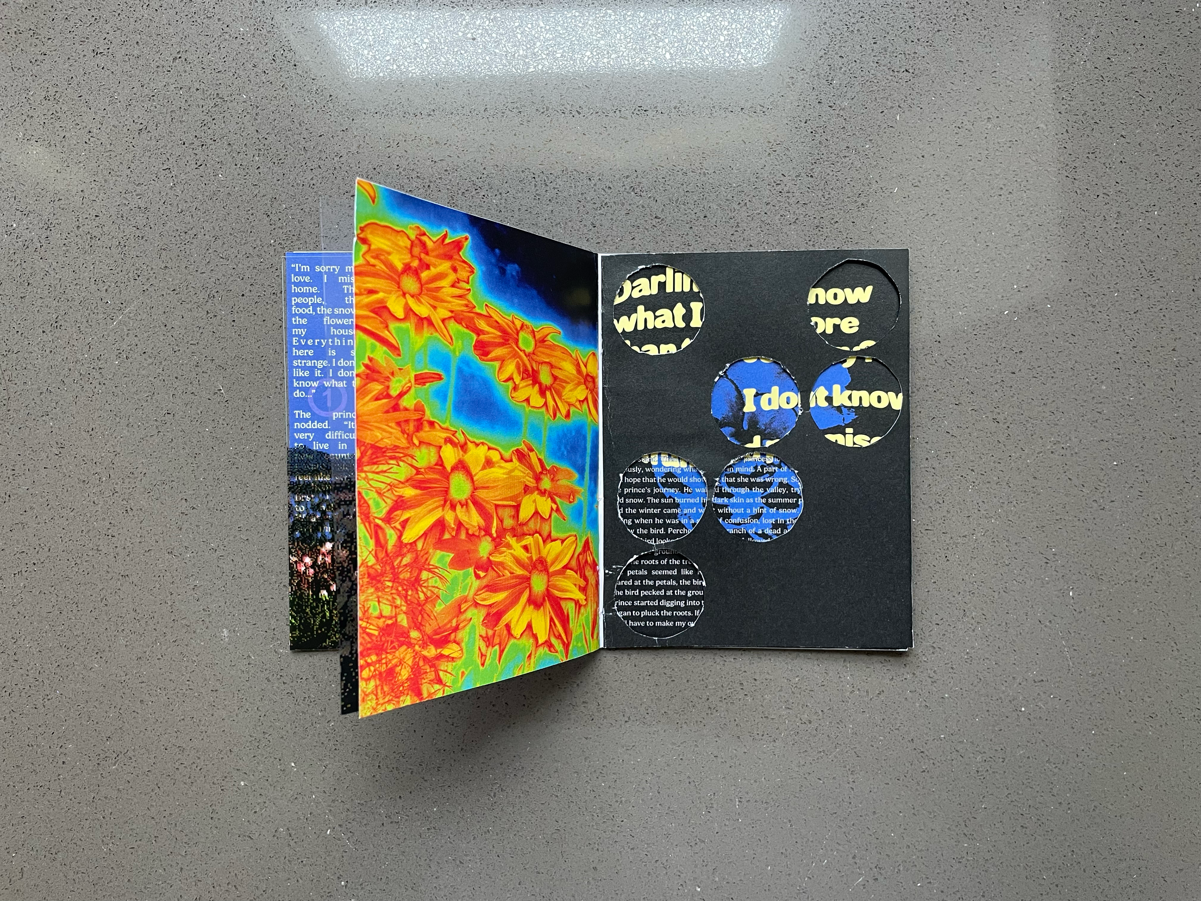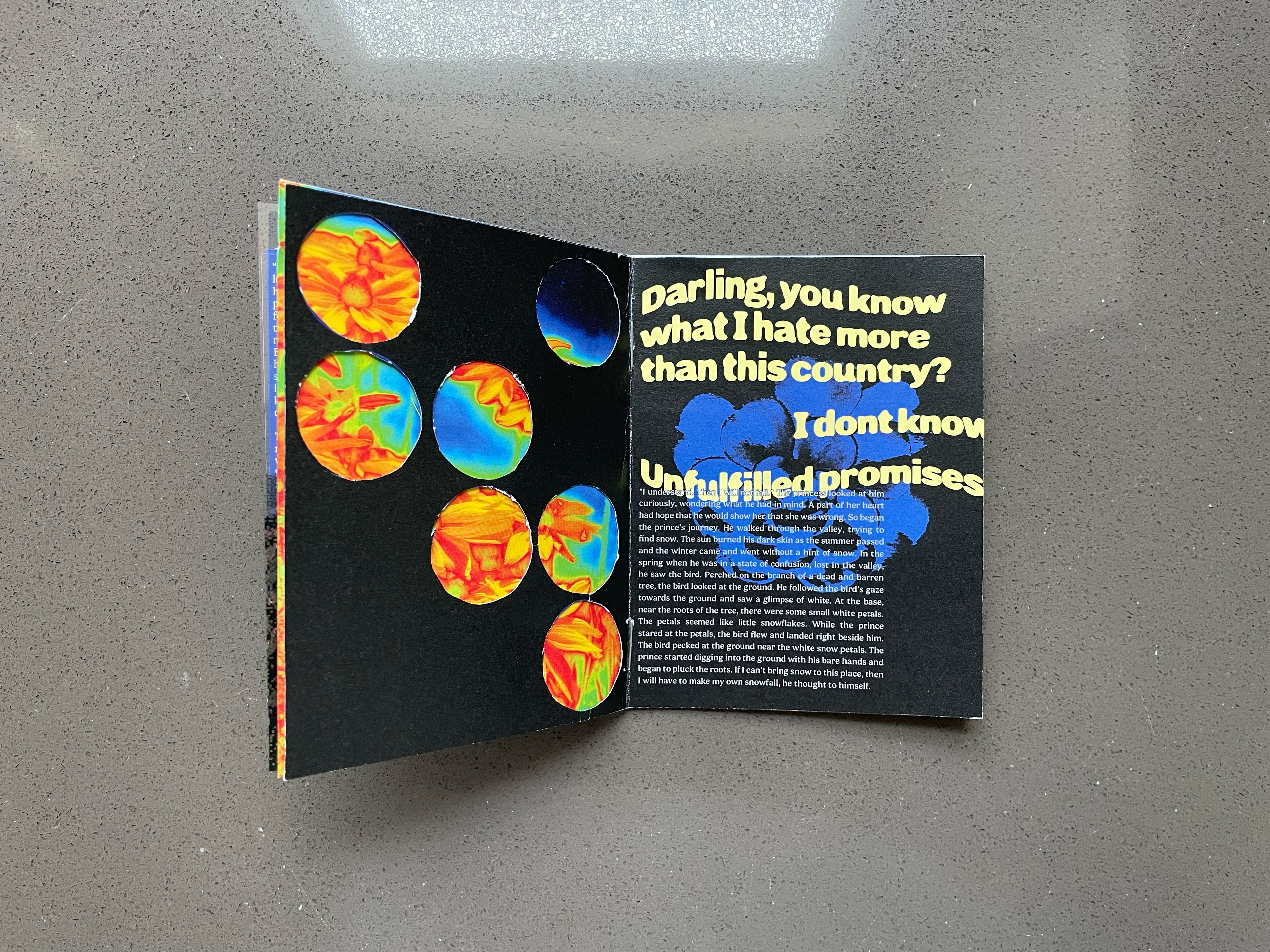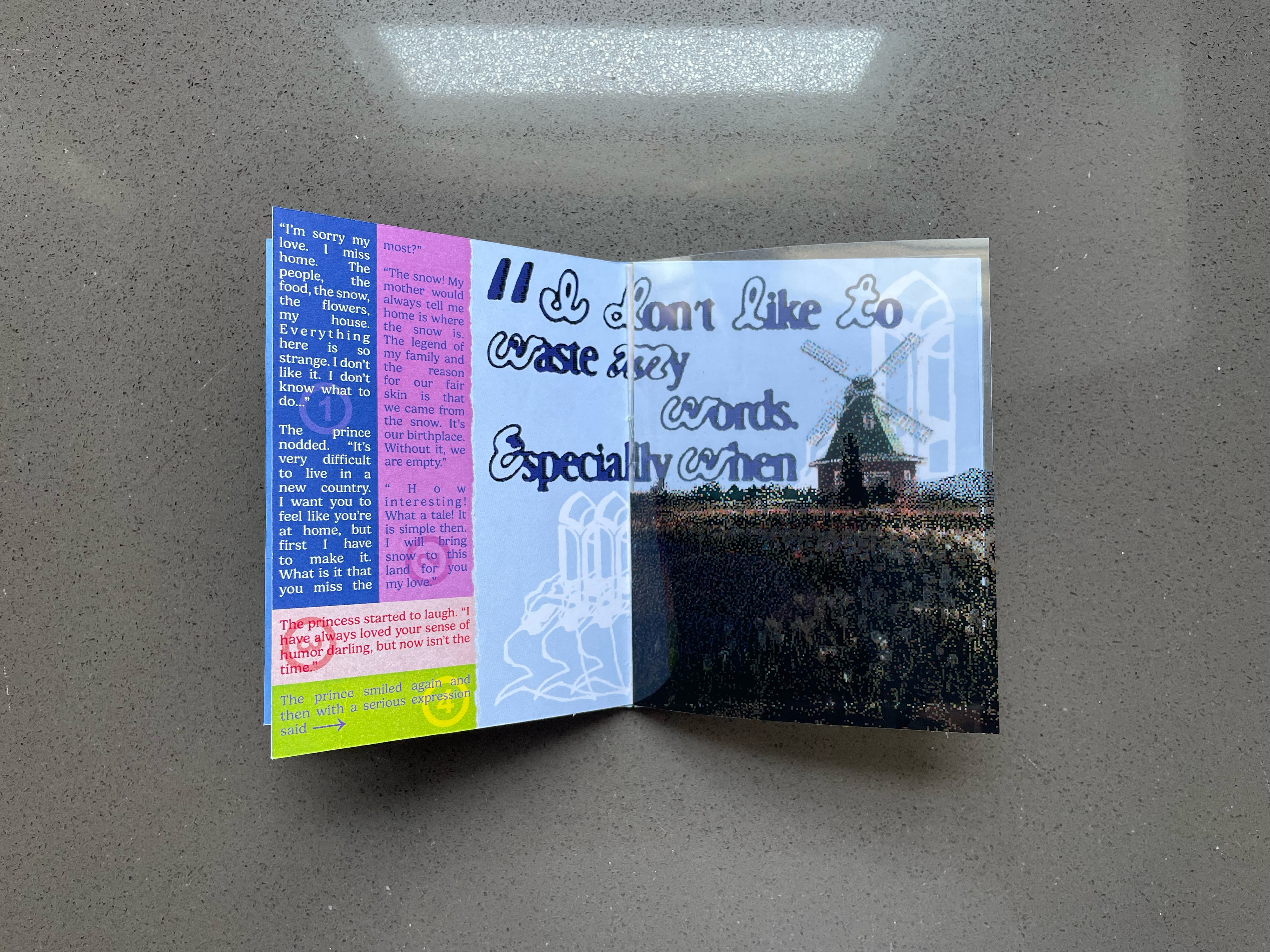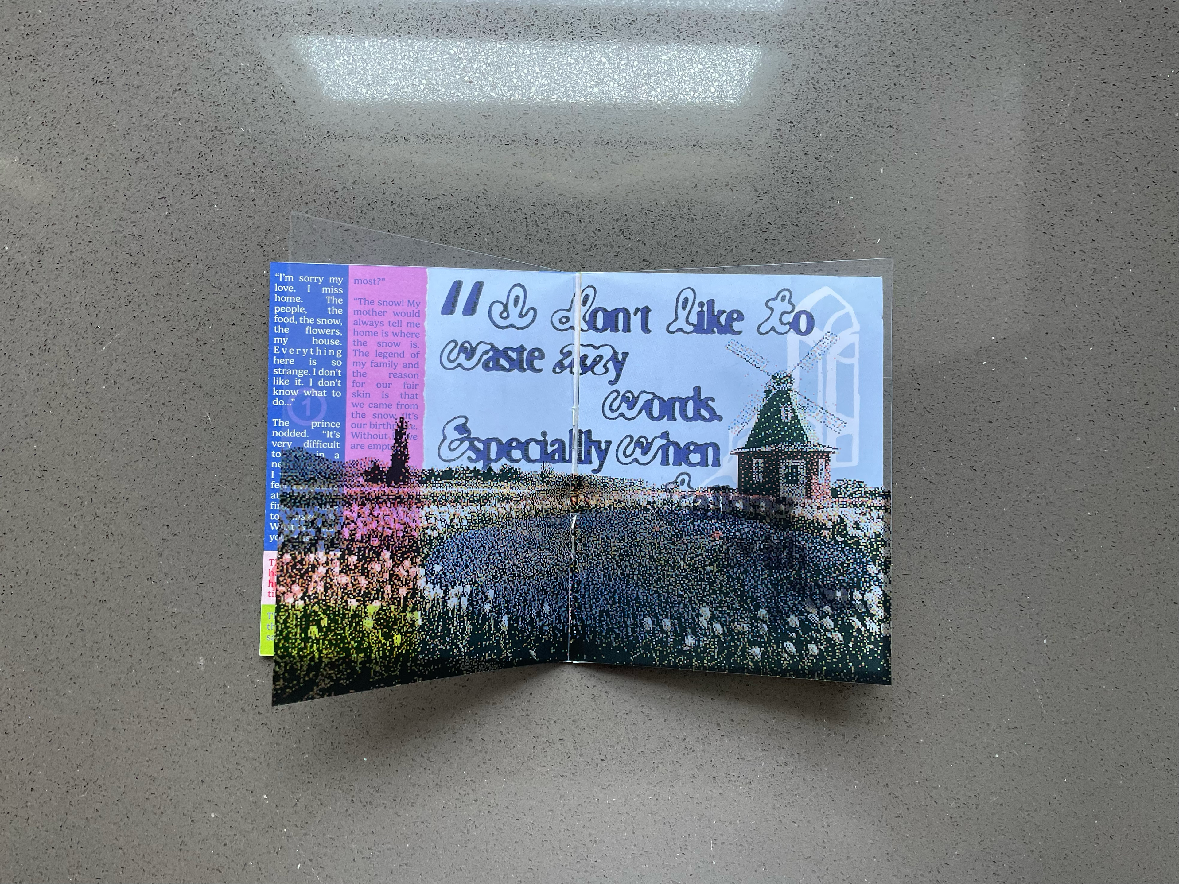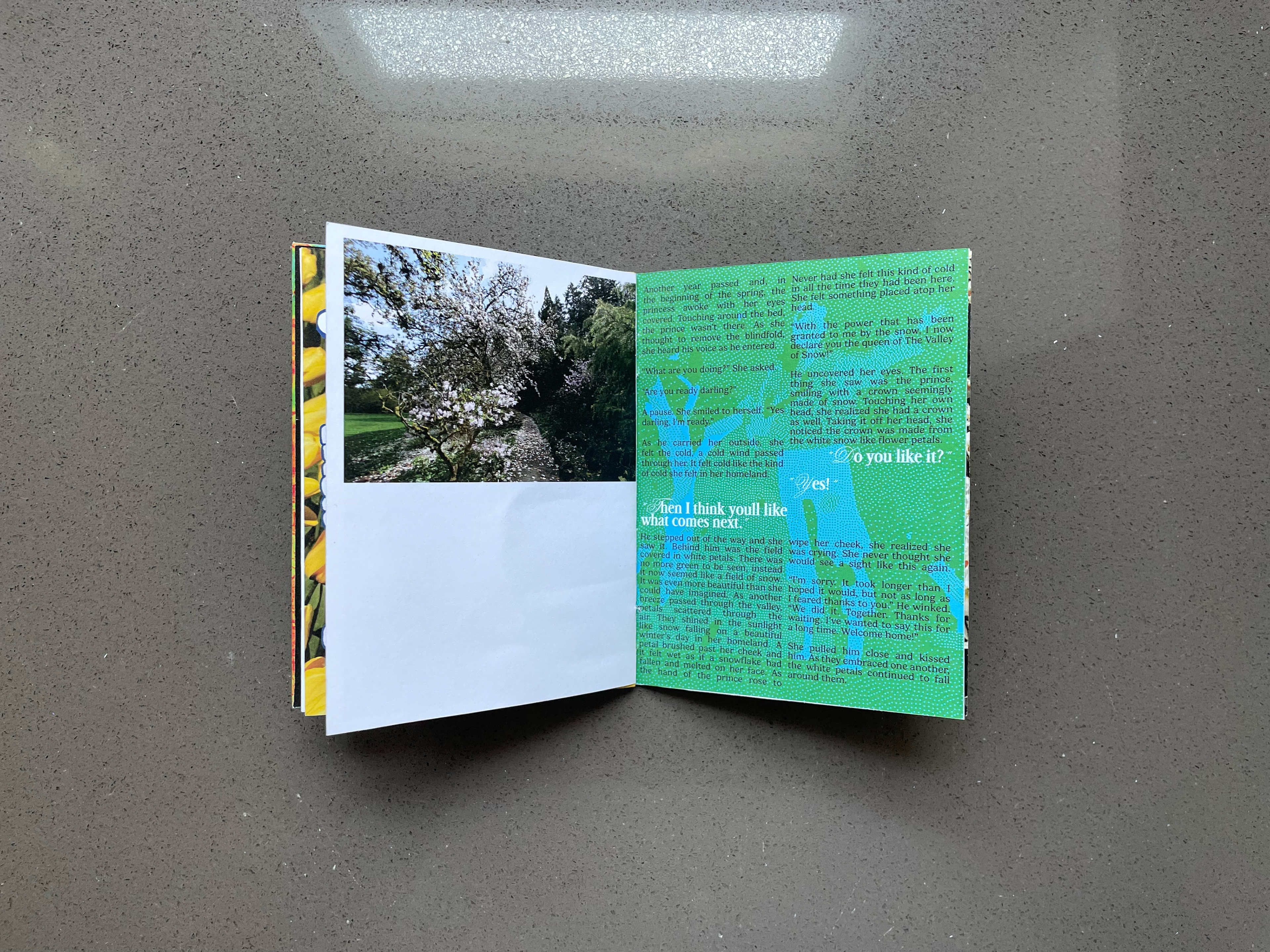 In collaboration with Philip and Aremo, I designed a zine that holds a story about a prince and a princess' compromise to finding a home. The story presents a special moment through the usage of flowers, which is the focus on the zine's theme.