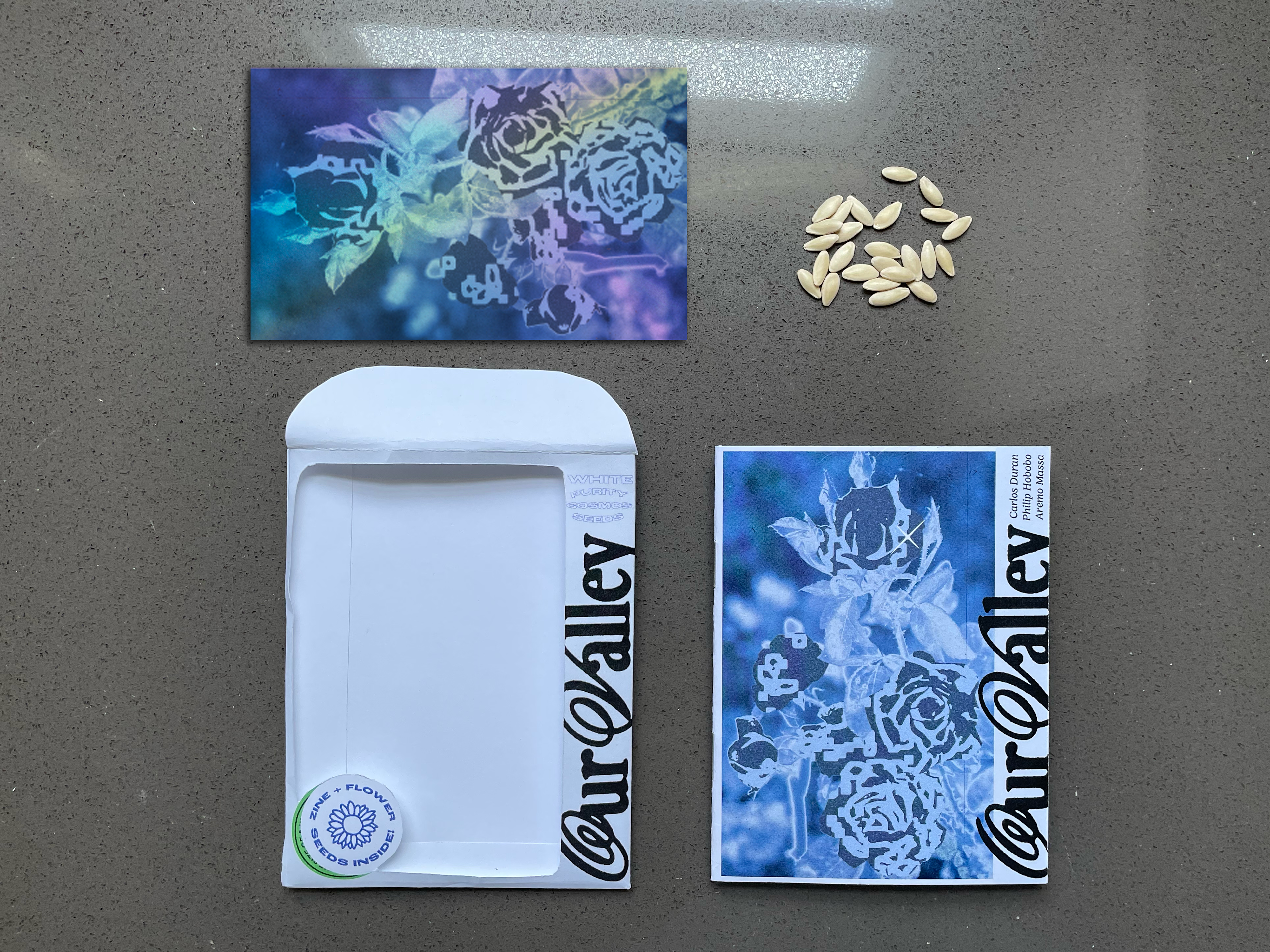 The packaging is accurate to that of a 3.5 x 4.5 packet of flower seeds and also holds seeds inside the package, as well as a holographic sticker of the main cover, and the zine itself.